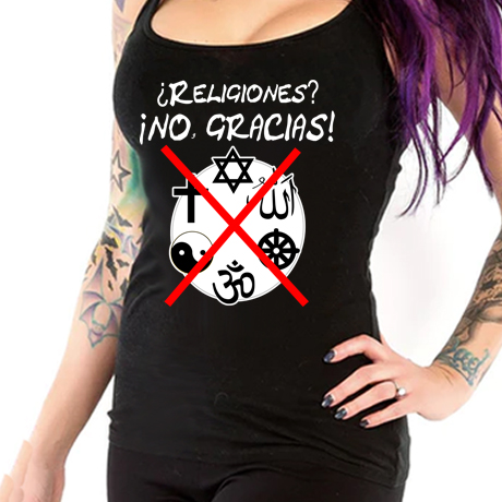 Camiseta Tirantes Religiones No Gracias Chica wallpunk.com, 100% algodón, tacto suave y agradable. Tejido de Alta Calidad con control de sustancias nocivas según Oeko Tex© Standard 100. Casual estilo informal. Diseño Original. Talla Europea. Si estás buscando camiseta de tirantes original para ti, o un regalo sorprendente para una amiga o para tu pareja, esta es tu camiseta ideal.