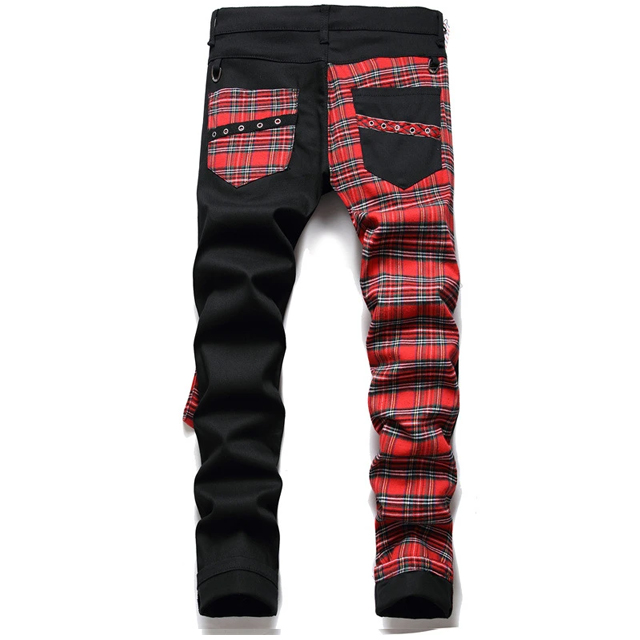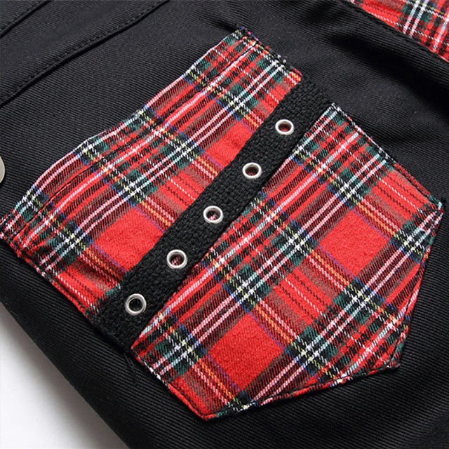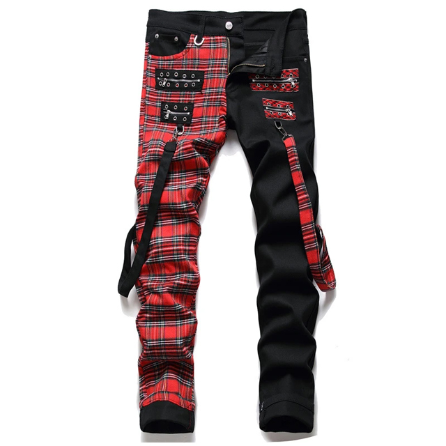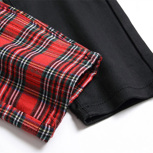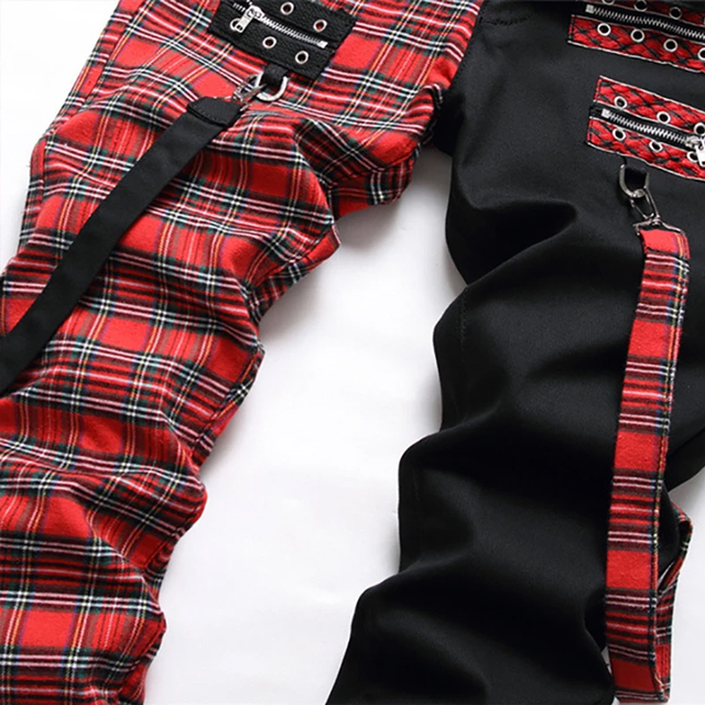 Pantalones Vaqueros Ajustados con Tirantes Punk, mitad negro, mitad a cuadros rojos, con remaches Punk, estampado, bolsillos y cremalleras.
